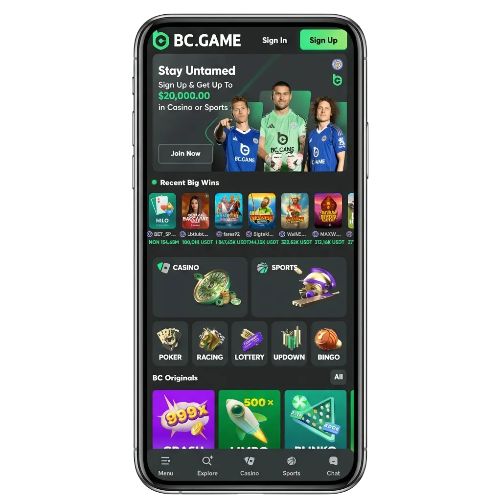 The BC Game interface is designed for mobile users who want quick access to casino games, sports betting, and account management. Navigation is simple, with clearly labelled tabs for Casino, Sports, Promotions, and Wallet, ensuring you can place bets or switch games in seconds.